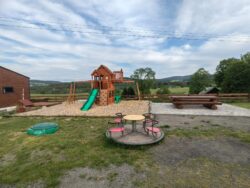 Dětské hřistě, velké sezení a ohniště vybavené roštem pro grilování.