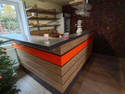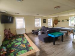Společenská místnost je vybavena barem, kulečníkem, elektronickými šipkami, TV a dětským koutkem.