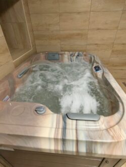 Prostorná vířivka pro dvě osoby s 36ti tryskami, sprchový kout a samostatné WC. Lehátka pro odpočinek.