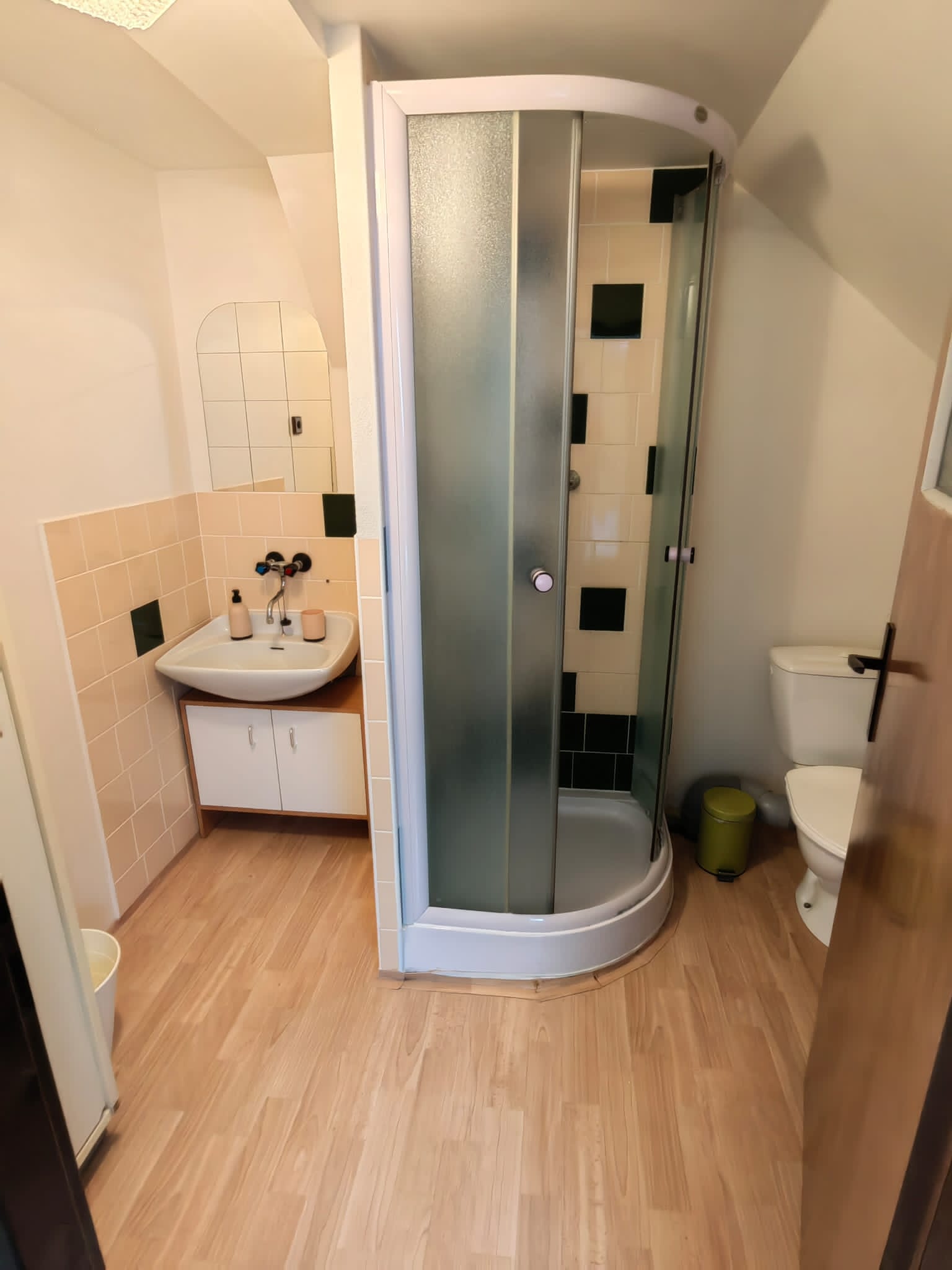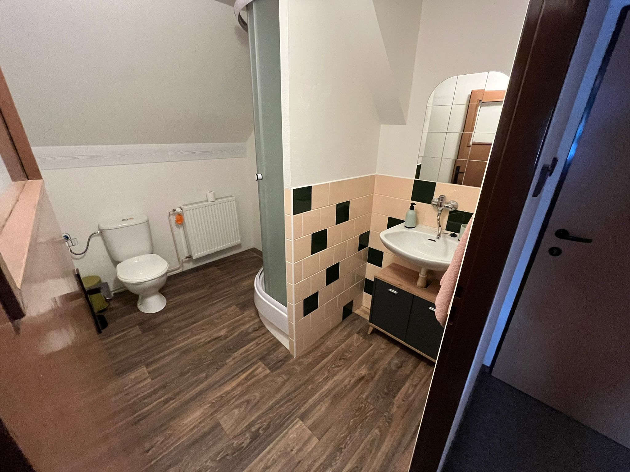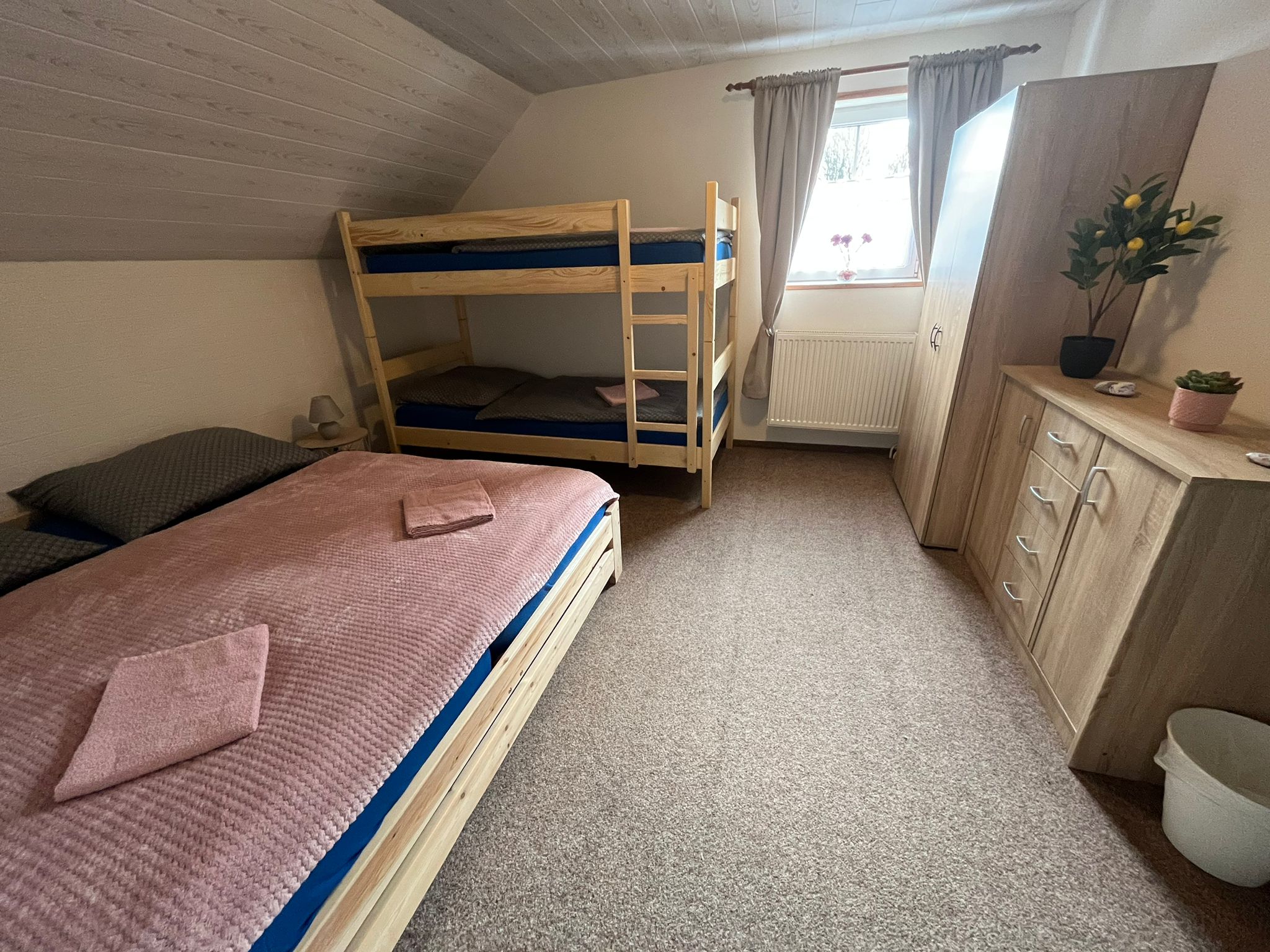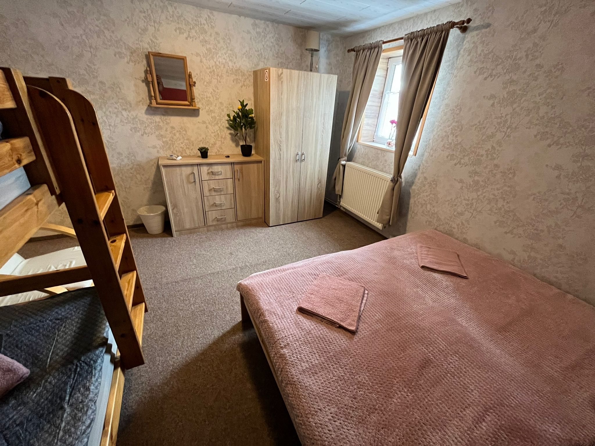 2. Pokoj: Čtyřlůžkový (manželská postel, palanda), vlastní koupelna s WC