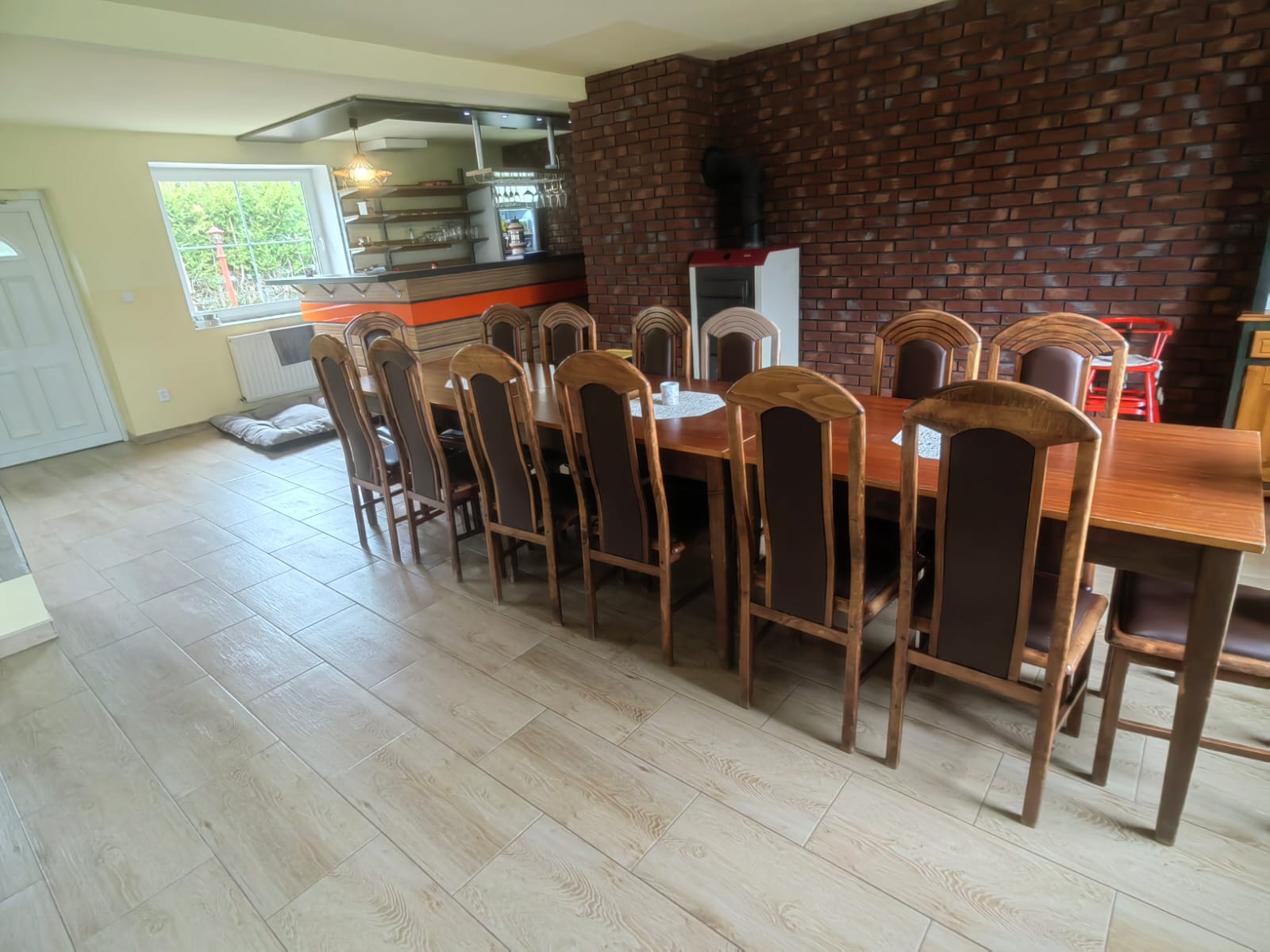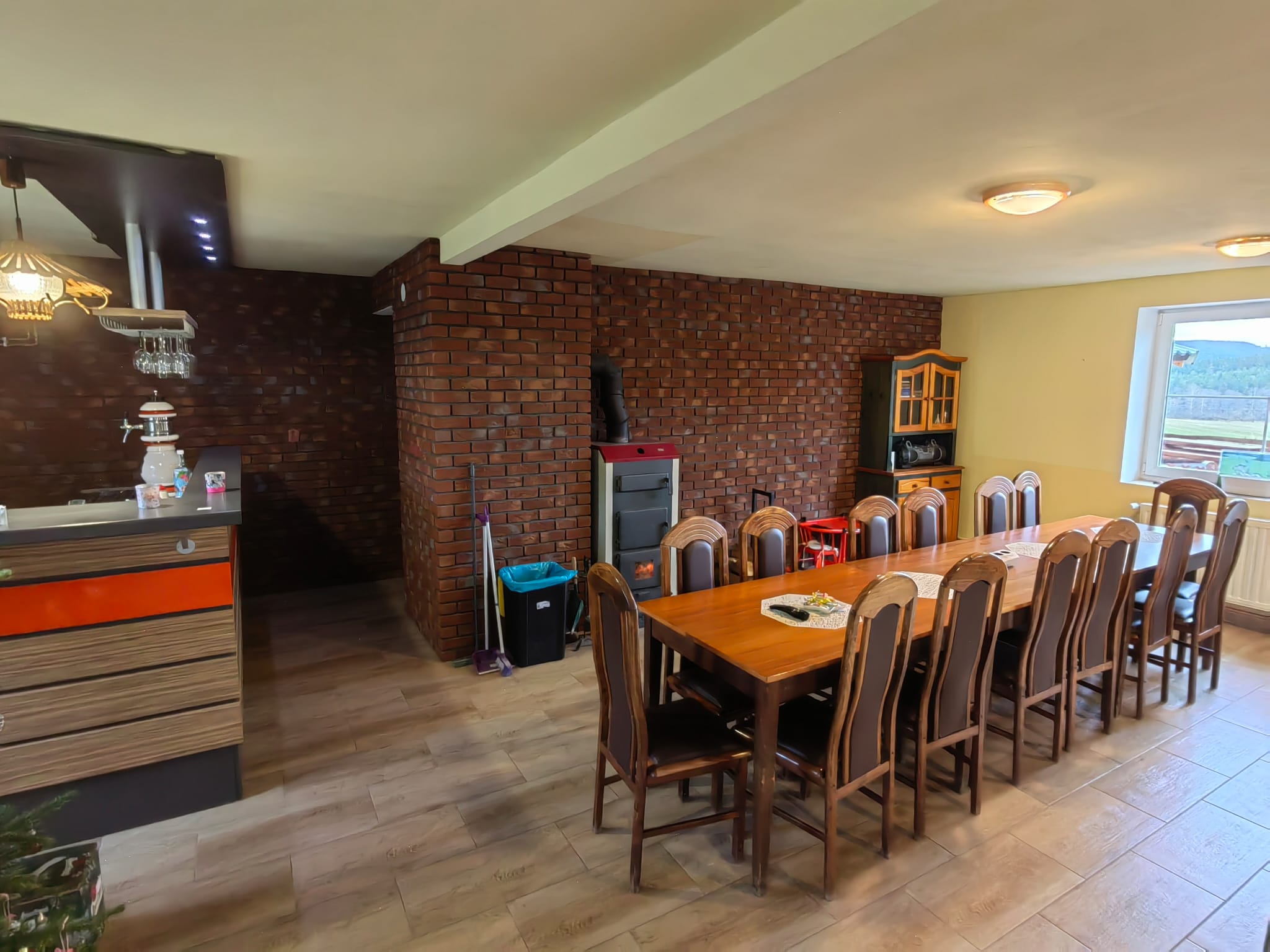V místnosti je velký stůl pro 12 osob pro společné stravování nebo rodinnou zábavu.