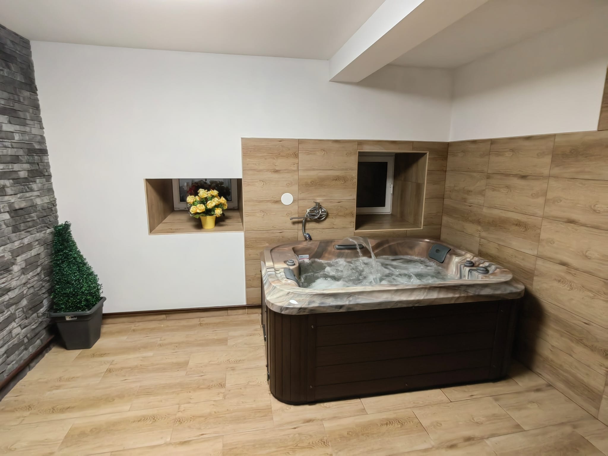 Prostorná vířivka pro dvě osoby s 36ti tryskami, sprchový kout a samostatné WC. Lehátka pro odpočinek.