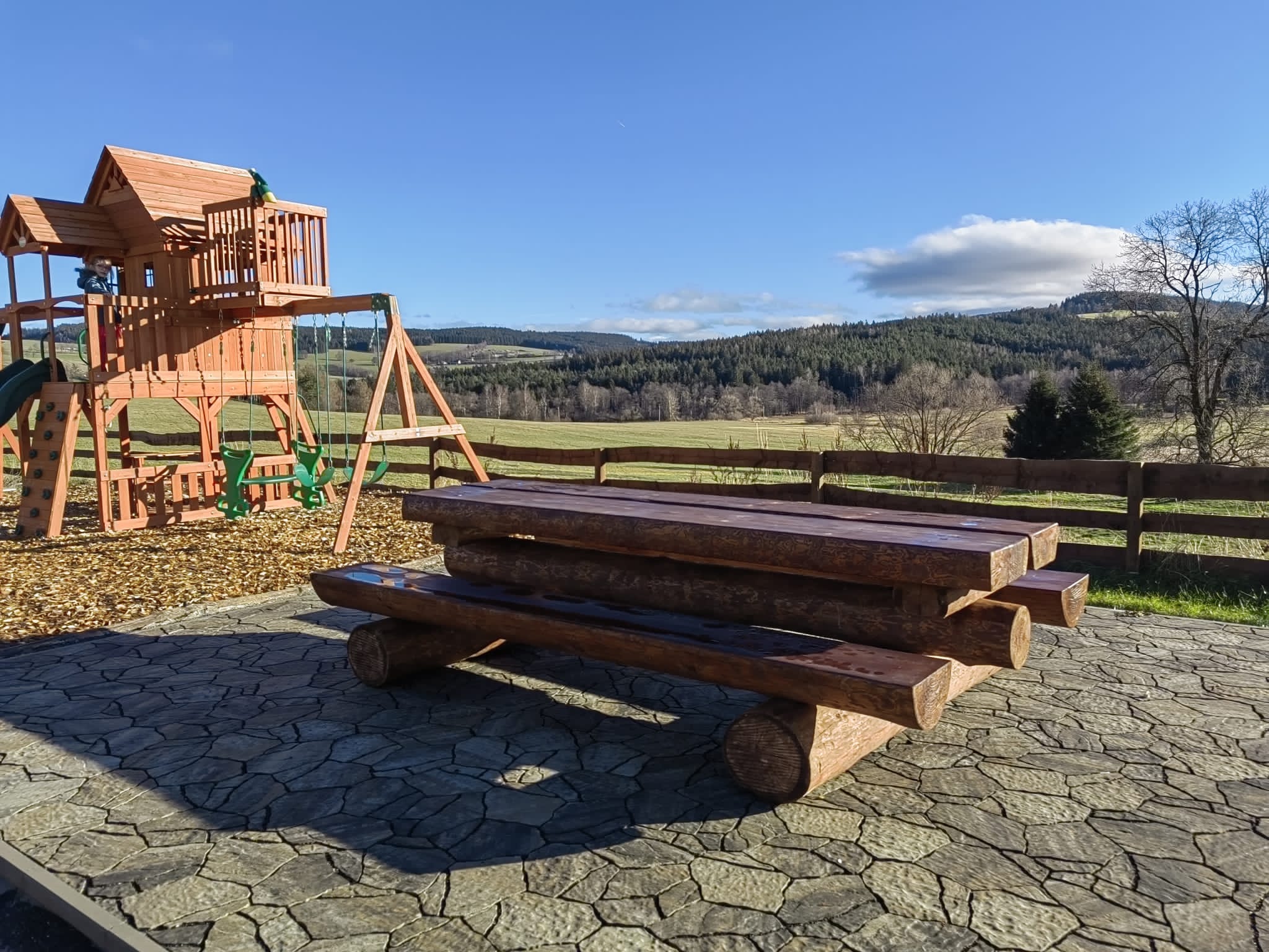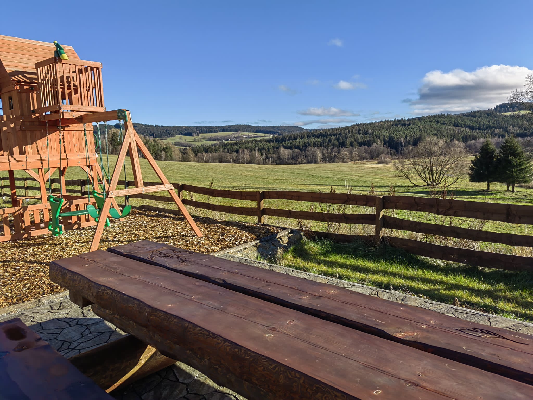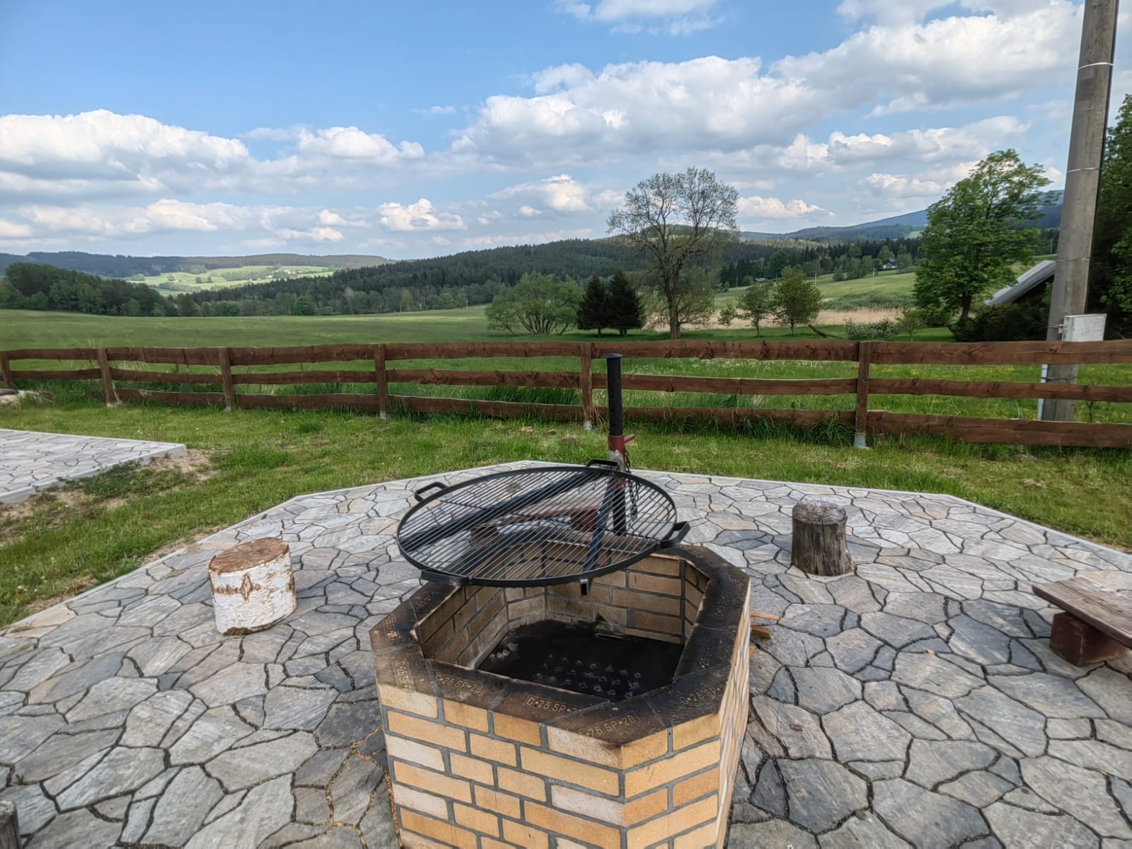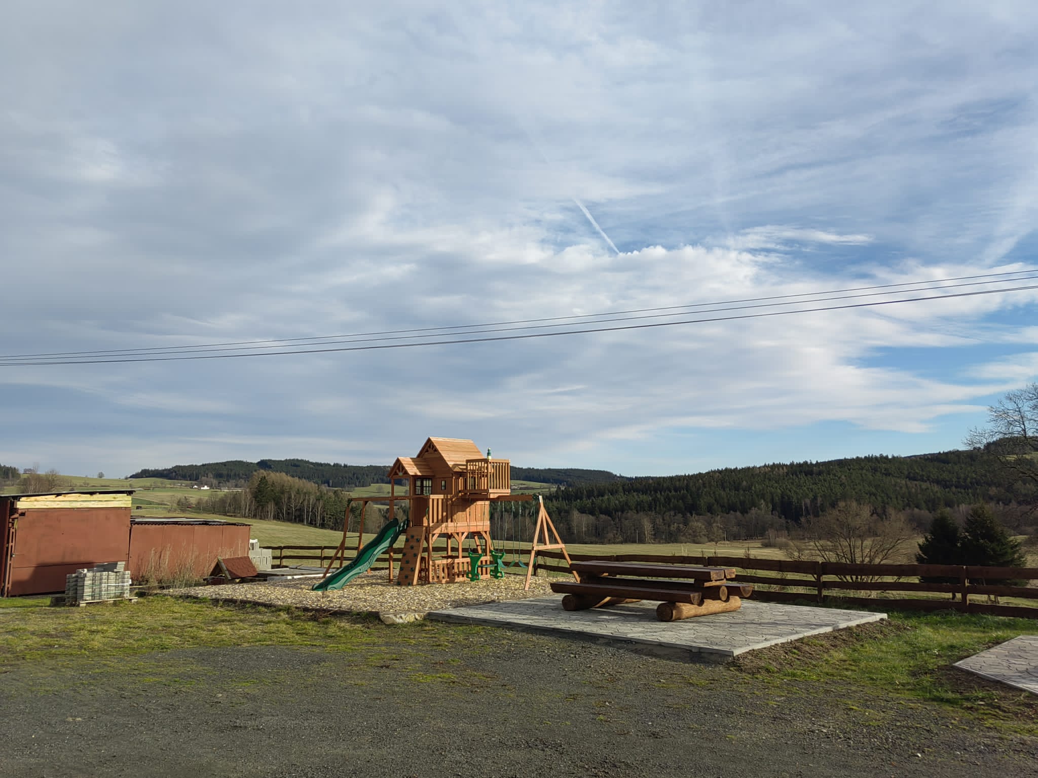 Dětské hřistě, velké sezení a ohniště vybavené roštem pro grilování.