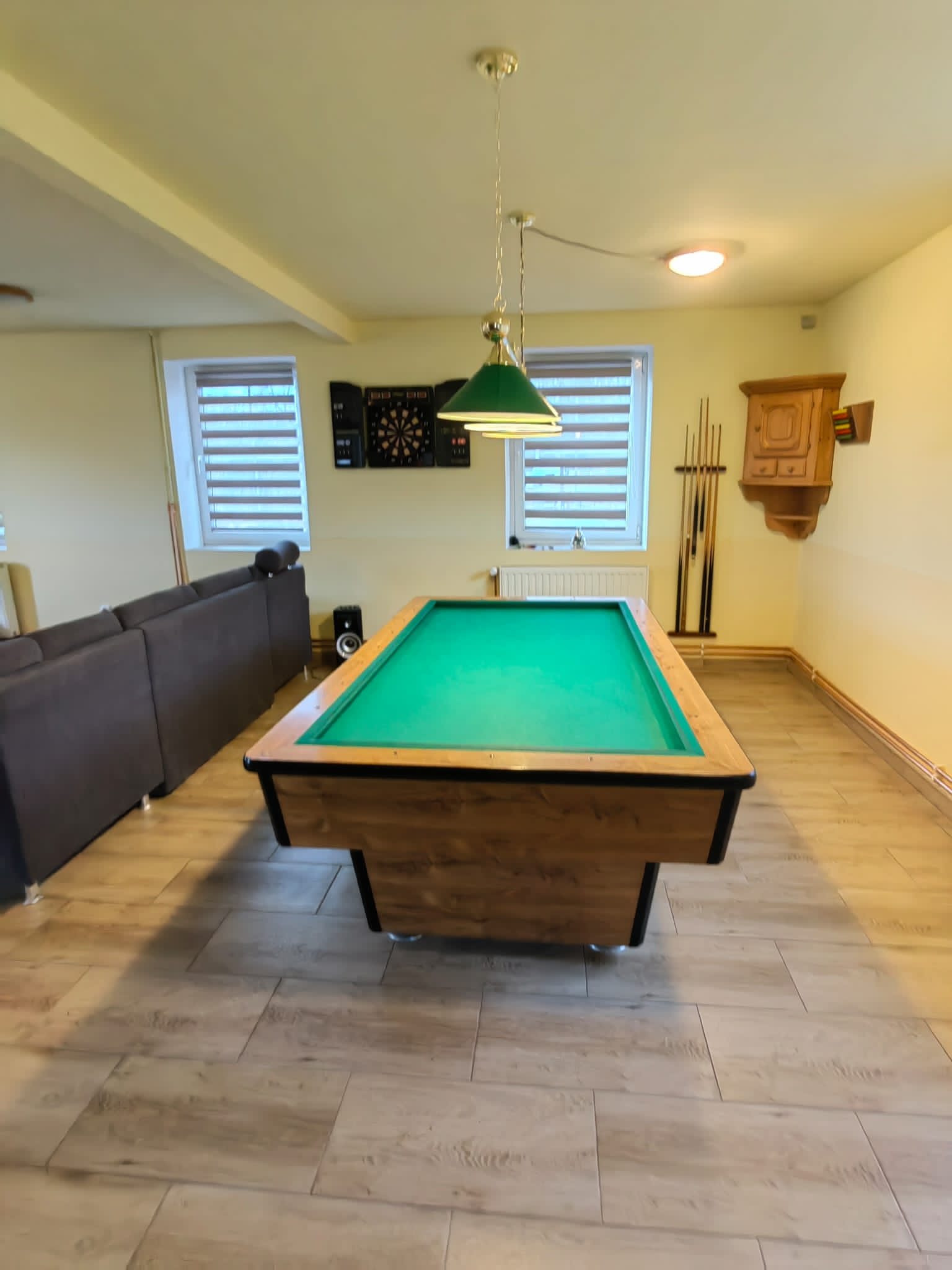 Společenská místnost je vybavena barem, kulečníkem, elektronickými šipkami, TV a dětským koutkem.